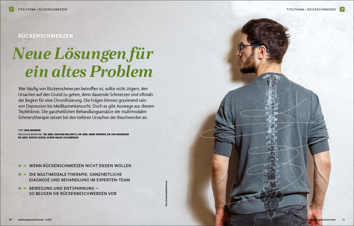 Wer häufig von Rückenschmerzen betroffen ist, sollte nicht zögern, den Ursachen auf den Grund zu gehen, denn dauernde Schmerzen sind oftmals der Beginn für eine Chronifizierung. Die Folgen können gravierend sein: von Depression bis Medikamentensucht. Doch es gibt Auswege aus diesem Teufelskreis: Die ganzheitlichen Behandlungsansätze der multimodalen Schmerztherapie setzen bei den tieferen Ursachen der Beschwerden an.