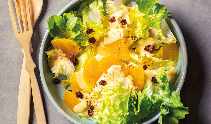 - Dressing über den Salat löffeln und mit den Endivienblättern vermengen. Rosinen abgießen, trocken tupfen und über den Salat streuen.