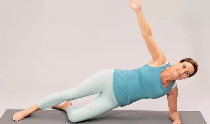 Dadurch bilden nun Oberschenkel, Rumpf und Kopf eine Linie. Achten Sie darauf, dass der Druck gleichmäßig auf Ellenbogen und dem aufliegenden Knie verteilt ist. Halten Sie diese Position, so lange wie möglich. Dann entspannen Sie sich. Nach einer Minute wechseln Sie die Seite.