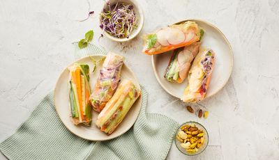 Zutaten: 3 Radieschen oder 1 rote Paprika, 1/2 Salatgurke 2 Karotten, 1 Handvoll Salatblätter nach Geschmack (z. B. Rucola, Eisberg- oder Eichblattsalat), ¼ Bund Minze, ¼ Bund Koriander, 100 g braune Reis- oder Glasnudeln, 10 Reispapierblätter (22 cm Durchmesser), 1 Handvoll Sprossen (z. B. Kresse, Radieschen- oder Brokkolisprossen), 3 EL Nüsse, Kerne oder Samen (z. B. Macadamianüsse, Kürbiskerne oder Sesam), optional: ½ Avocado oder 200 g Tofu, in Würfel geschnitten und angebraten.
