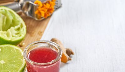 Zutaten: 2 cm frischer Ingwer, 2 cm Kurkumawurzel, Cranberry- oder schwarzer Johannisbeersaft