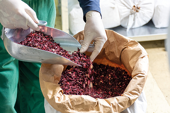| Ob Hibiskusblüten (Fotos rechts), Brennnesselblätter, Matetee oder Baldrianwurzel, nur die hochwertigste Ware gelangt in die Produktion. | ![]() |