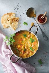 - Möhren und Süßkartoffeln hinzufügen und kurz mitbraten, dann mit Wasser oder Gemüsebrühe ablöschen, kurz aufkochen und etwa 25 Minuten köcheln lassen