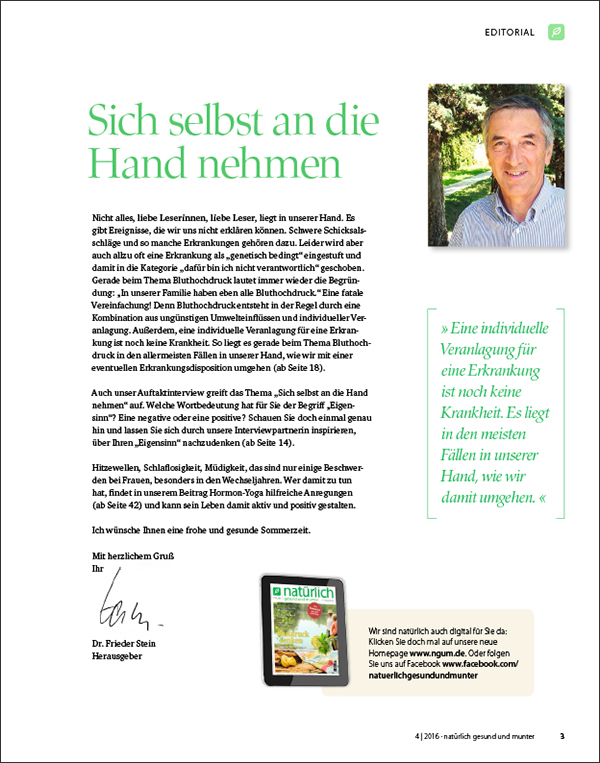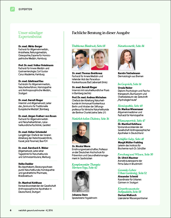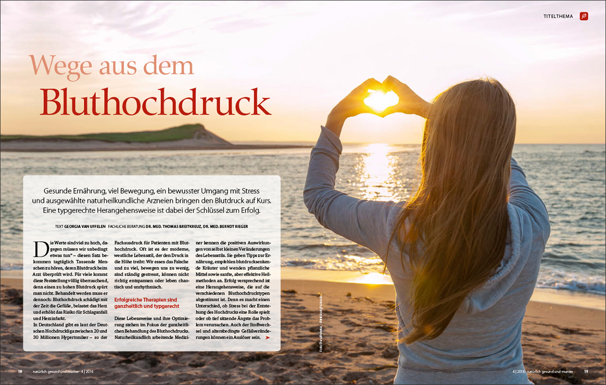 Gesunde Ernährung, viel Bewegung, ein bewusster Umgang mit Stress und ausgewählte naturheilkundliche Arzneien bringen den Blutdruck auf Kurs. Eine typgerechte Herangehensweise ist dabei der Schlüssel zum Erfolg. Sie orientiert sich an dem 3-Typen-Konzept, das in vielen anthroposophischen Praxen und Krankenhäusern eingesetzt wird und an einer viergliedrigen Einteilung, die auf der Traditionellen Europäischen Elementelehre basiert.