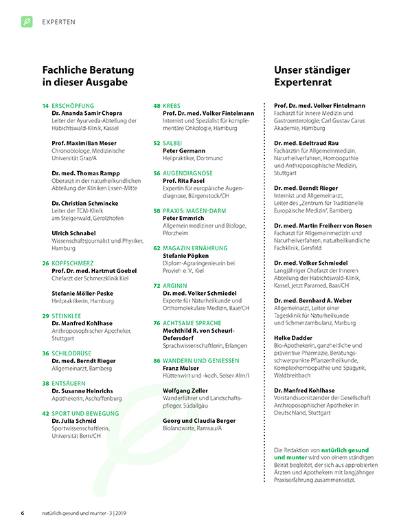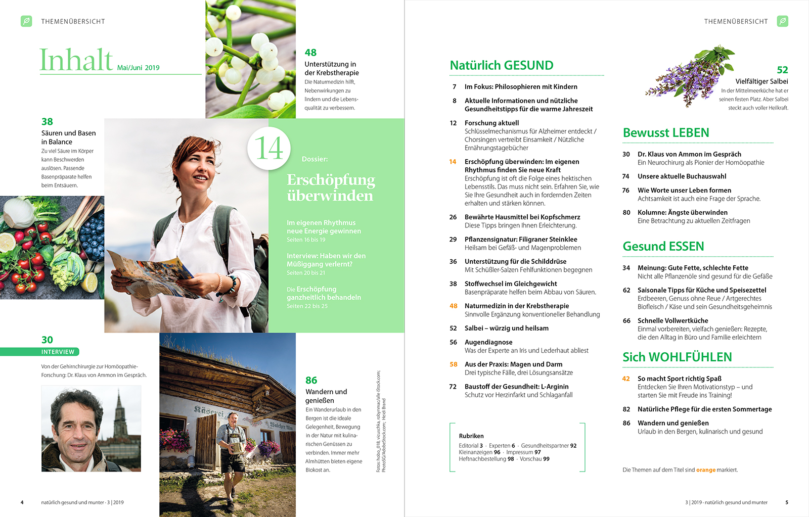 Alles ist Ihnen zu viel, Sie funktionieren nur noch und müssen alle Kräfte mobilisieren, um den Alltag zu meistern? Dann ist es Zeit, auf Spurensuche zu gehen. Erfahren Sie im großen Titeldossier dieser Ausgabe, welche Ursachen bei Erschöpfungszuständen eine Rolle spielen und was ein rhythmischerer Lebensstil bringen kann.