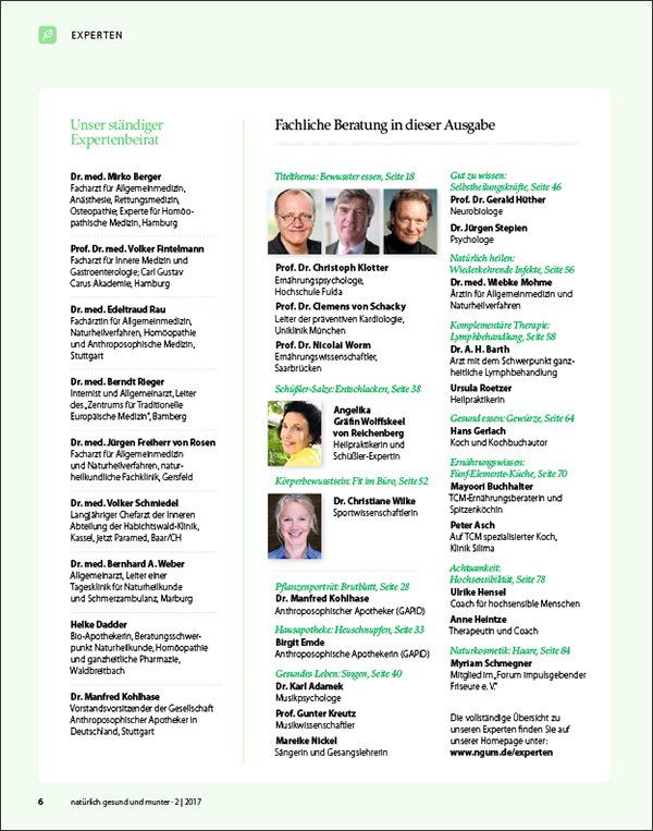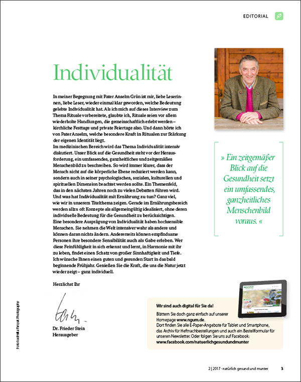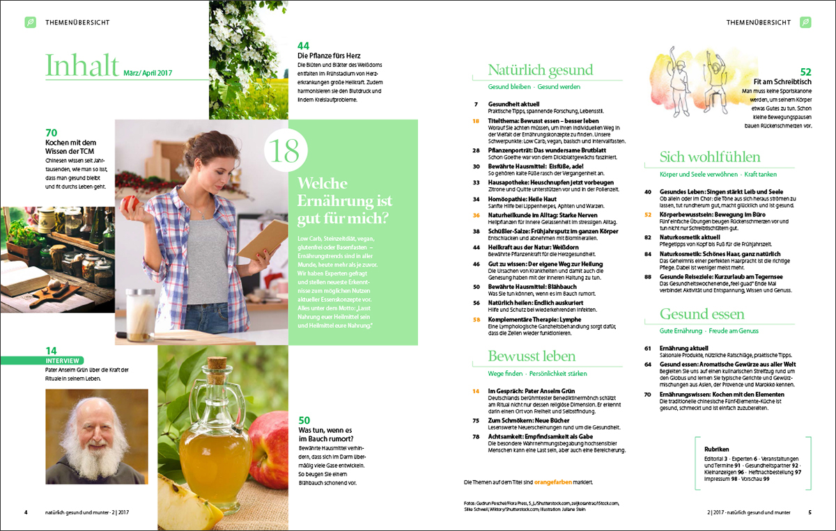 Low Carb, Steinzeitdiät, vegan, glutenfrei, Basen- oder Intervallfasten – Ernährungstrends sind in aller Munde, heute mehr als je zuvor. In dieser Ausgabe stellen wir neueste Erkenntnisse zum möglichen Nutzen aktueller Essenskonzepte vor. Alles unter dem Motto: „Lasst Nahrung euer Heilmittel sein und Heilmittel eure Nahrung.“