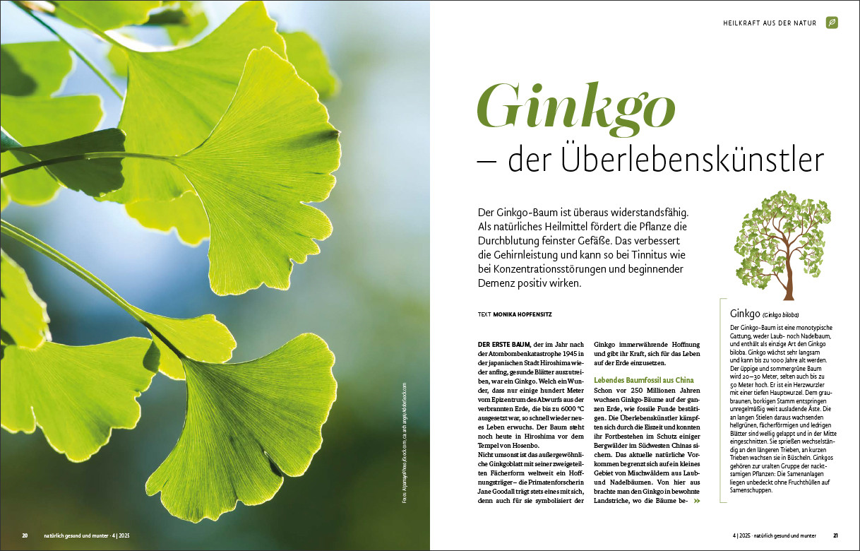Der Ginkgo-Baum ist überaus widerstandsfähig. Als natürliches Heilmittel fördert die Pflanze die Durchblutung feinster Gefäße. Das verbessert die Gehirnleistung und kann so bei Tinnitus wie bei Konzentrationsstörungen und beginnender Demenz positiv wirken.