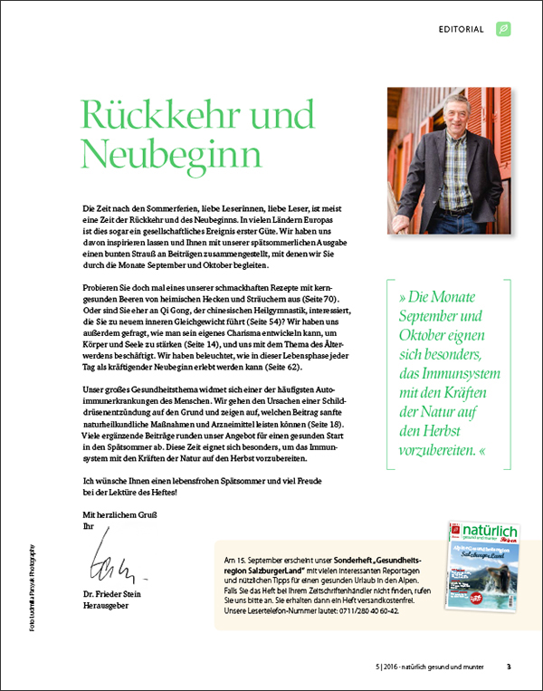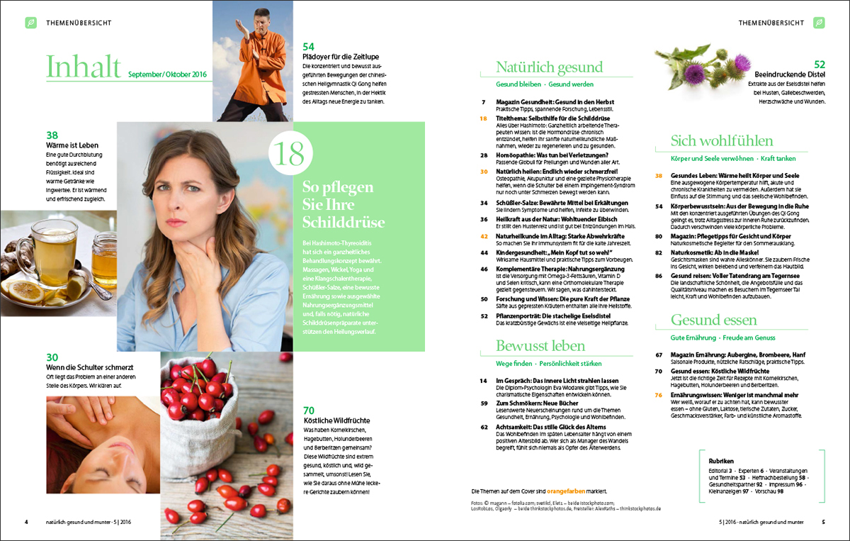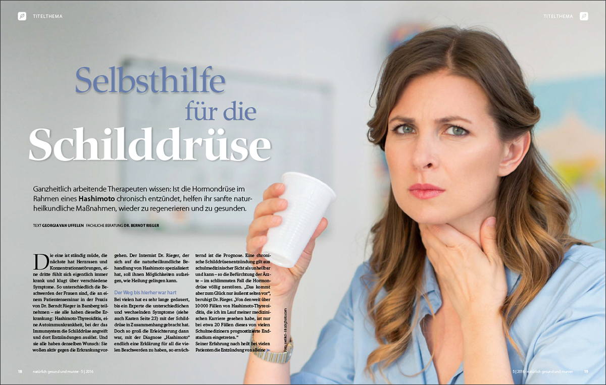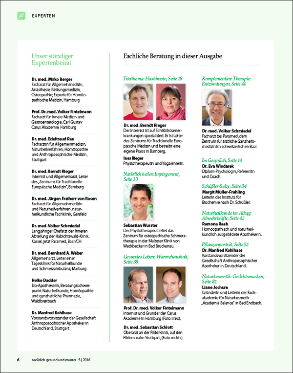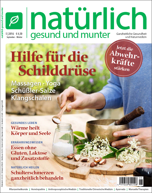 Bei Hashimoto-Thyreoiditis hat sich ein ganzheitliches Behandlungskonzept bewährt. Wie Massagen, Wickel, Yoga und eine Klangschalentherapie, Schüßler-Salze, eine bewusste Ernährung sowie ausgewählte Nahrungsergänzungsmittel und, falls nötig, natürliche Schilddrüsenpräparate den Heilungsverlauf unterstützen, erfahren Sie in dieser Ausgabe. Ist die Schilddrüse im Rahmen eines Hashimoto chronisch entzündet, helfen sanfte naturheilkundliche Maßnahmen der Hormondrüse, wieder zu regenerieren und zu gesunden.