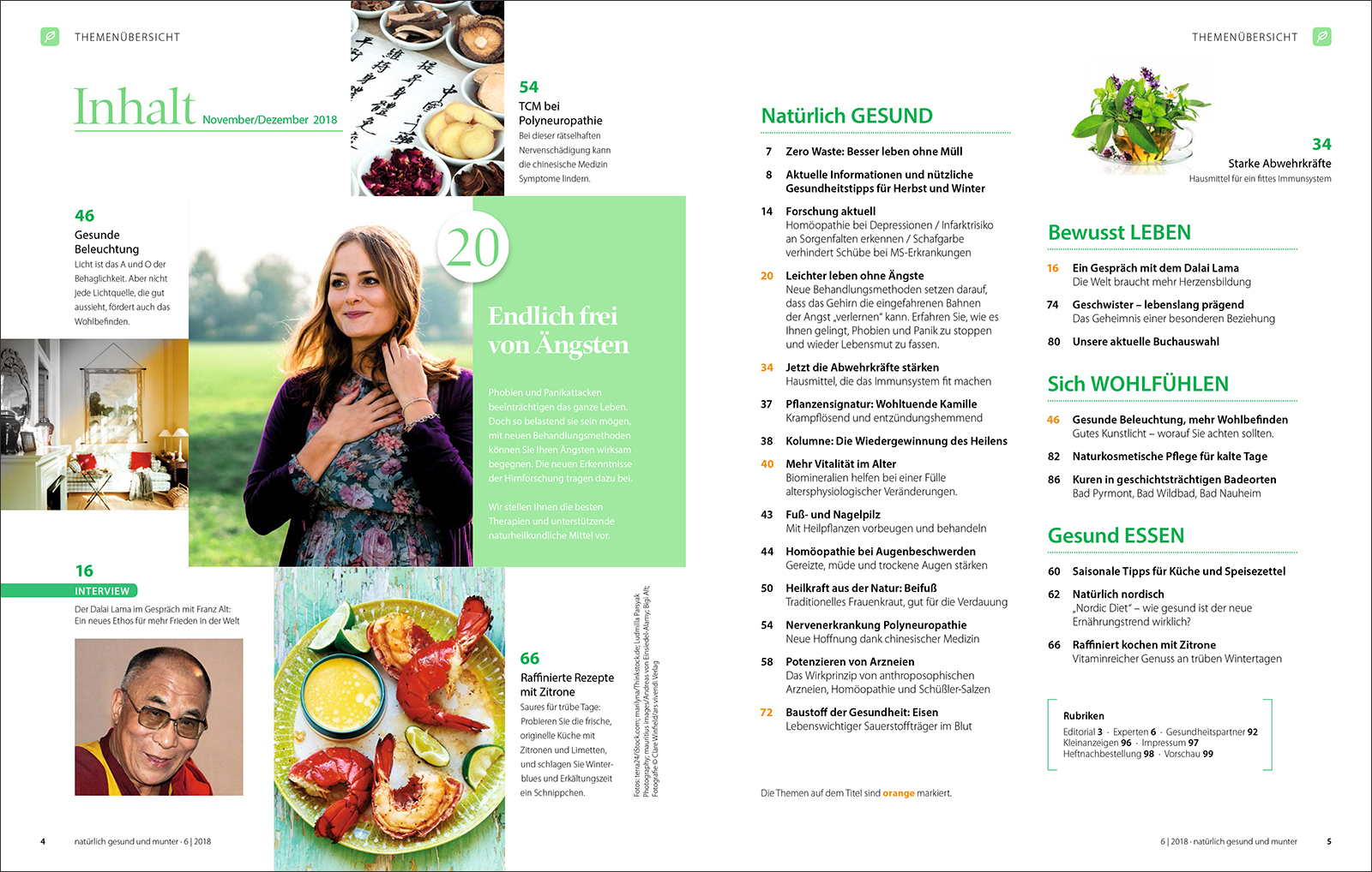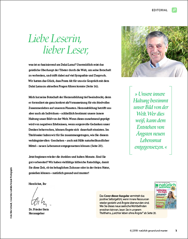 Phobien und Angstgefühle beeinträchtigen das ganze Leben. In dieser Ausgabe lesen Sie, wie die Hirnforschung leicht umzusetzende Möglichkeiten eröffnet, die Wurzeln der Angst zu erkennen und zu überwinden, und wie die Naturheilkunde Symptome wie Unruhe, Nervosität und Schlafstörungen lindern kann.
