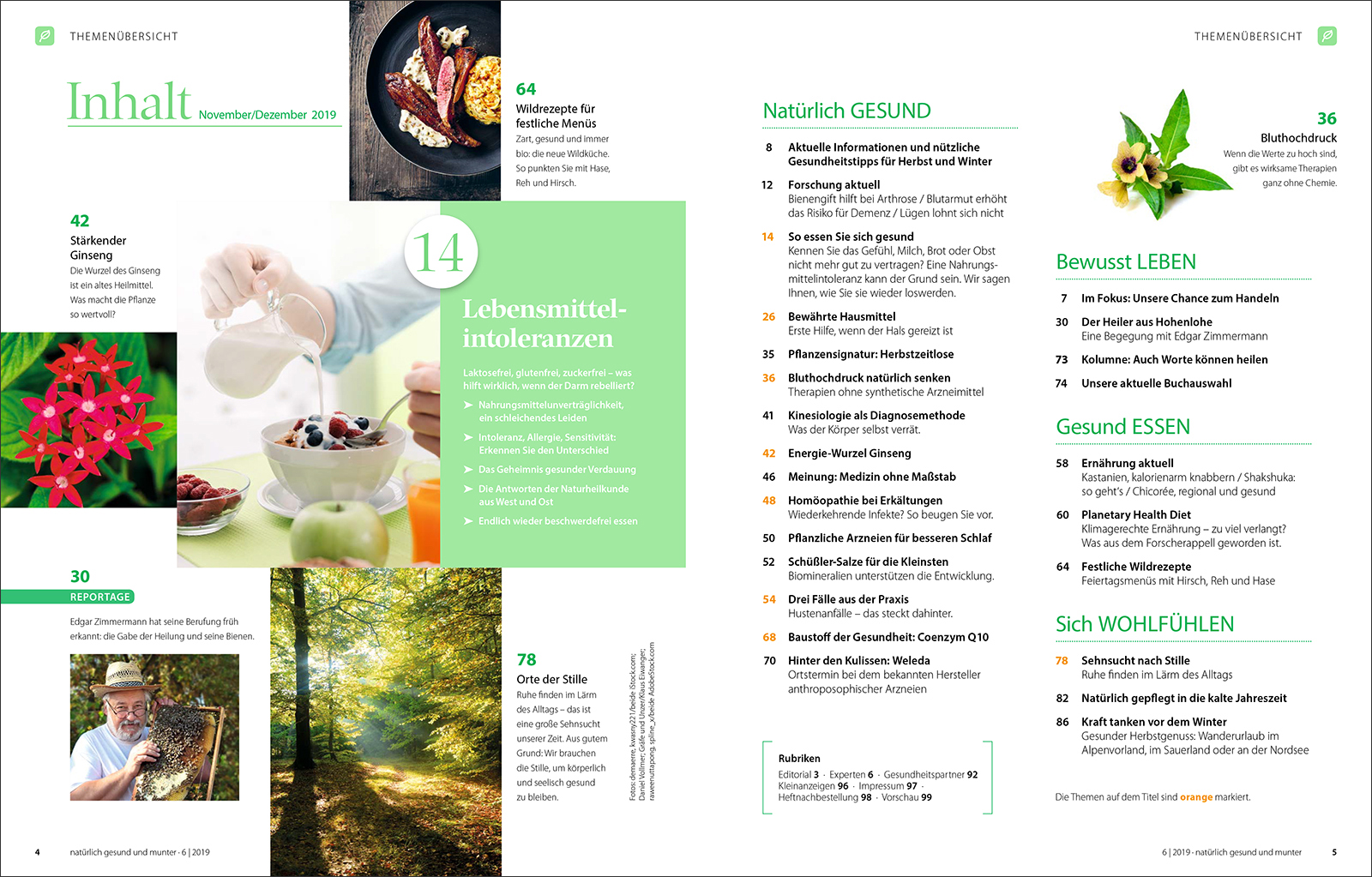 Kennen Sie das Gefühl, Milch- und Weizenprodukte oder Obst immer schlechter zu vertragen? Im großen Titeldossier der Ausgabe erfahren Sie, wie Unverträglichkeiten entstehen – denn mit diesem Wissen haben Sie eine gute Chance, sie wieder loszuwerden. Zudem stellen wir ganzheitliche Herangehensweisen traditioneller Heilsysteme aus West und Fernost vor, die nicht nur Darm und Verdauung behandeln, sondern den Blick auf den ganzen Menschen richten.