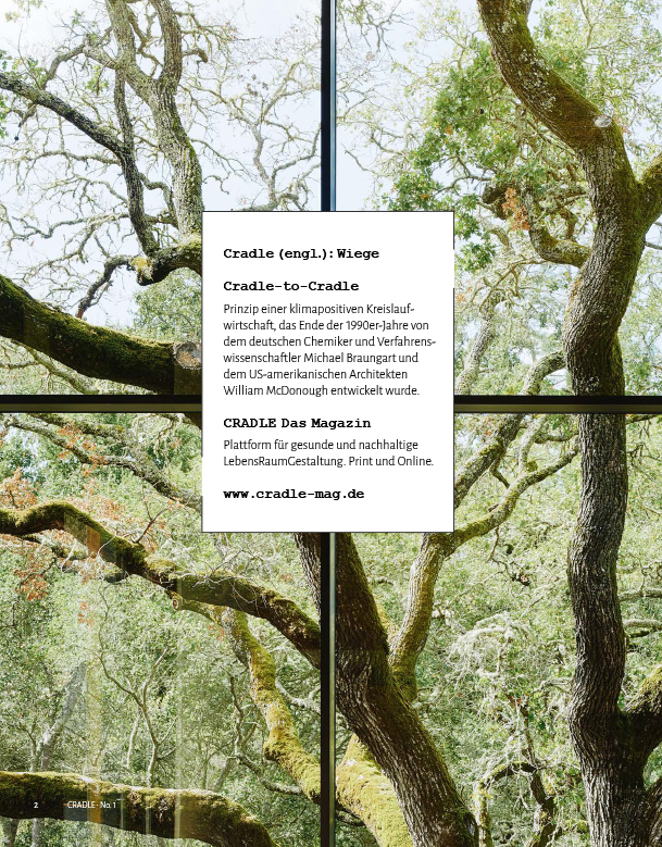 Mehr Ideen für nachhaltige Lösungen in den Bereichen Bauen, Wohnen und Design finden Sie im Onlineportal www.cradle-mag.de.
