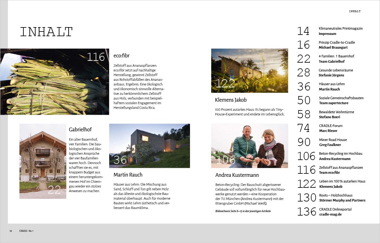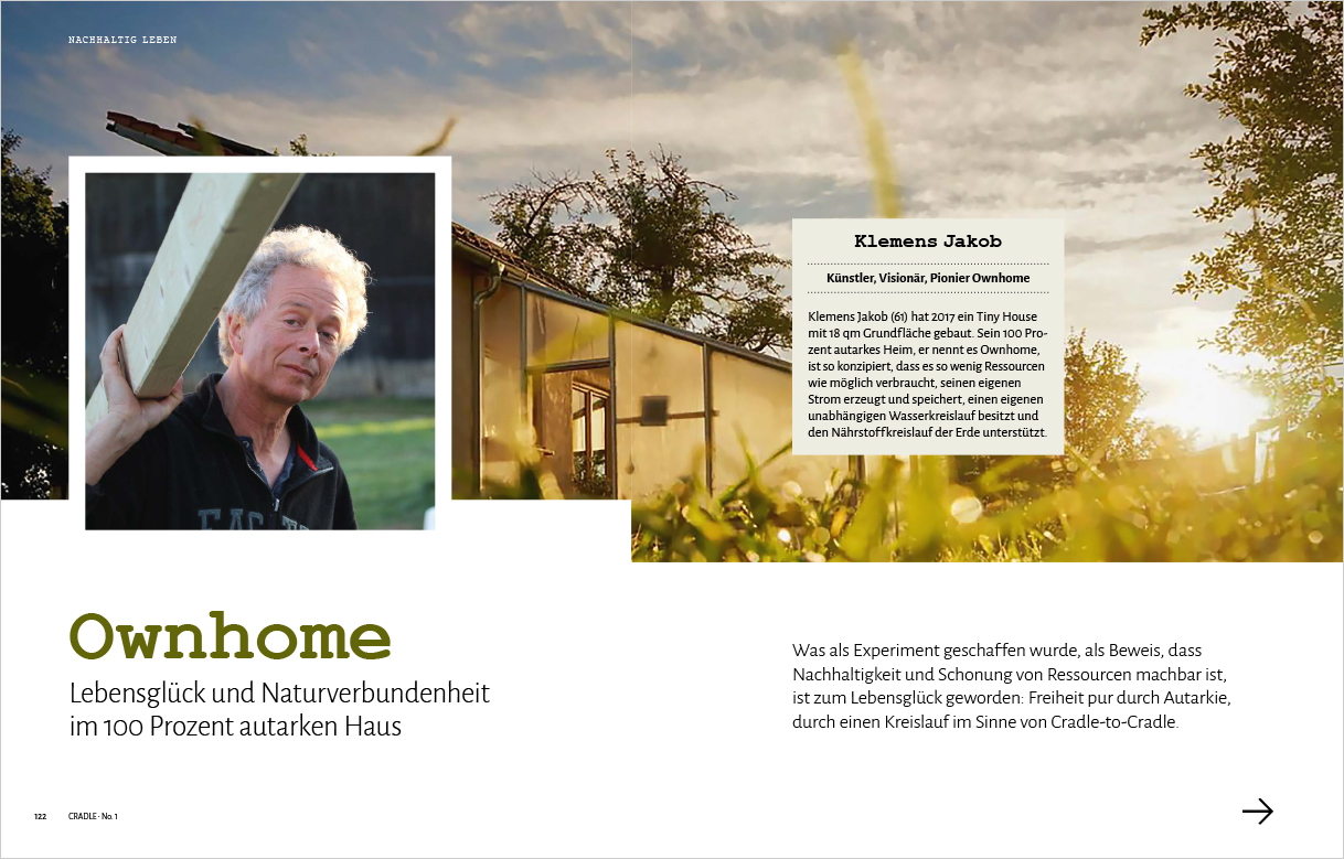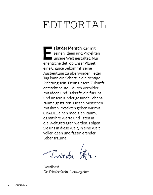 Es ist der Mensch, der mit seinen Ideen und Projekten unsere Welt gestaltet. Nur er entscheidet, ob unser Planet eine Chance bekommt, seine Ausbeutung zu überwinden. Jeder Tag kann dabei ein Schritt in die richtige Richtung sein. Denn unsere Zukunft entsteht heute, durch Vorbilder mit Ideen und Tatkraft, die für uns und unsere Kinder gesunde Lebensräume gestalten. Diesen Menschen mit ihren Projekten gibt CRADLE Print einen medialen Raum, damit ihre Werte und Taten in die Welt getragen werden. Folgen Sie uns in diese Welt, in eine Welt voller Ideen und faszinierender Lebensräume.