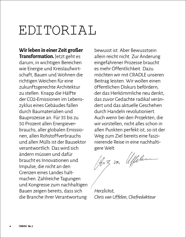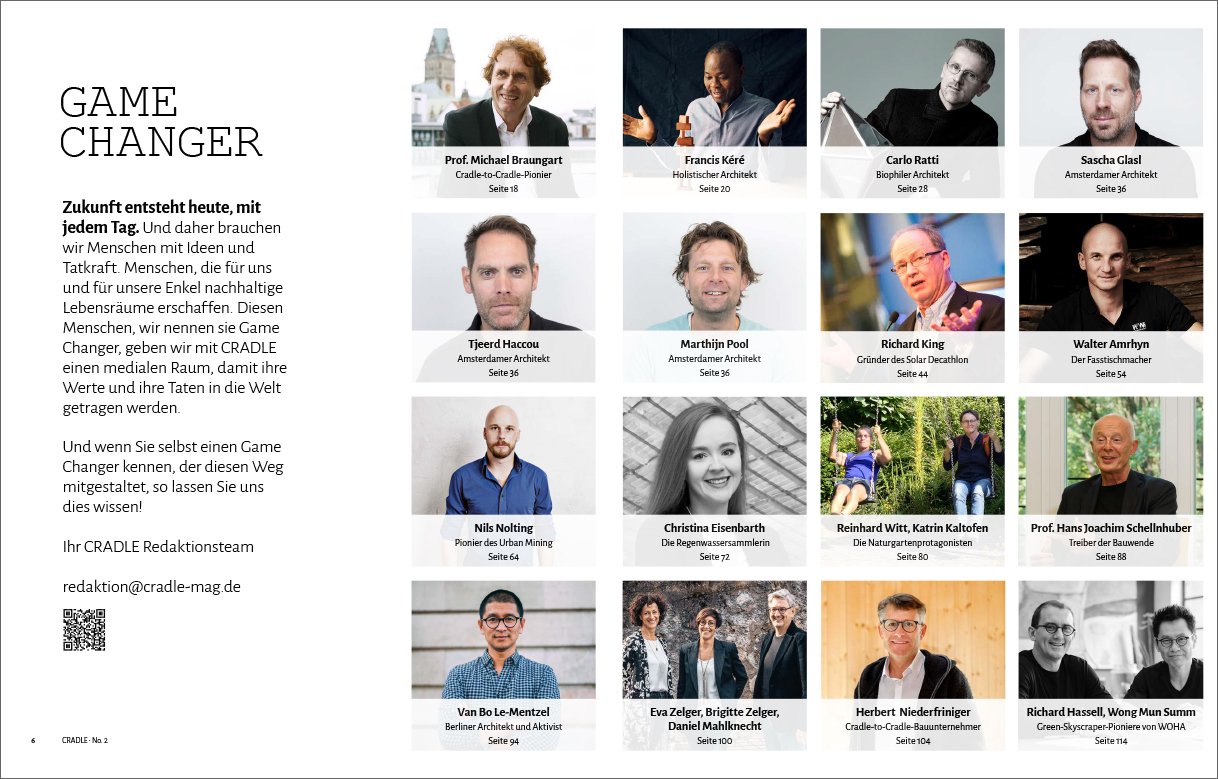 Es ist der Mensch, der mit seinen Ideen und Projekten unsere Welt gestaltet. Nur er entscheidet, ob unser Planet eine Chance bekommt, seine Ausbeutung zu überwinden. Jeder Tag kann dabei ein Schritt in die richtige Richtung sein. Denn unsere Zukunft entsteht heute, durch Vorbilder mit Ideen und Tatkraft, die für uns und unsere Kinder gesunde Lebensräume gestalten. Diesen Menschen mit ihren Projekten gibt CRADLE Print einen medialen Raum, damit ihre Werte und Taten in die Welt getragen werden. Folgen Sie uns in diese Welt, in eine Welt voller Ideen und faszinierender Lebensräume.