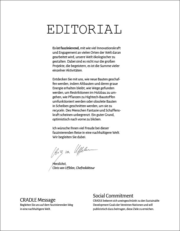 Es ist der Mensch, der mit seinen Ideen und Projekten unsere Welt gestaltet. Nur er entscheidet, ob unser Planet eine Chance bekommt, seine Ausbeutung zu überwinden. Jeder Tag kann dabei ein Schritt in die richtige Richtung sein. Denn unsere Zukunft entsteht heute, durch Vorbilder mit Ideen und Tatkraft, die für uns und unsere Kinder gesunde Lebensräume gestalten. Diesen Menschen mit ihren Projekten gibt CRADLE Print einen medialen Raum, damit ihre Werte und Taten in die Welt getragen werden. Folgen Sie uns in diese Welt, in eine Welt voller Ideen und faszinierender Lebensräume.