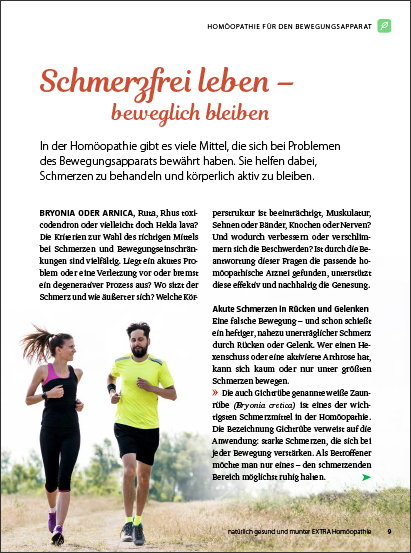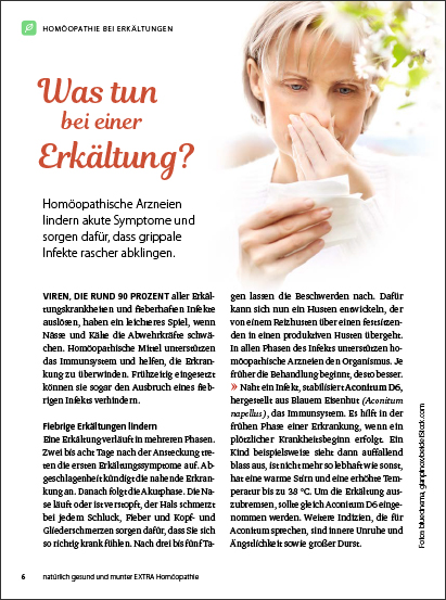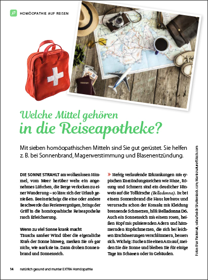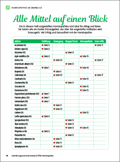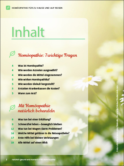 Passend eingesetzte homöopathische Arzneien helfen bei einer Vielzahl von Beschwerden. Lernen Sie in diesem natürlich gesund und munter Extra hilfreiche Globuli kennen, mit denen Sie in Selbstmedikation akute Symptome von Erkältungen und Magen-Darm-Problemen lindern können. Zudem reduzieren die Mittel Schmerzen und Beschwerden am Bewegungsapparat und sind ideal zur Ersten Hilfe nach Verletzungen. Damit gehören sie in jede Reiseapotheke.